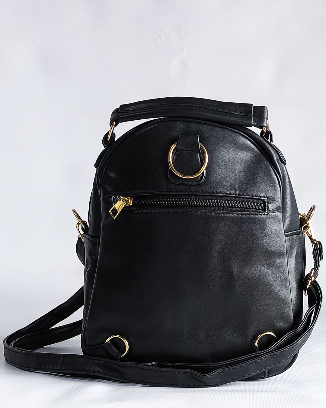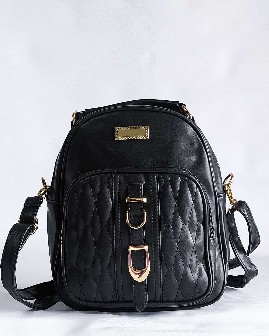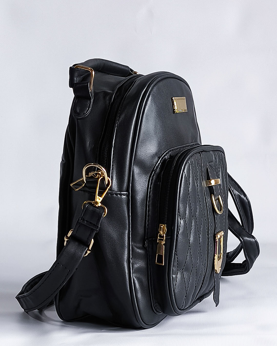 Esta mochila de cuero sintético negra es ideal para uso diario o para viajes. Cuenta con detalles metálicos dorados, un amplio espacio interior y una correa ajustable para mayor comodidad. Su diseño acolchado y moderno te hará destacar en cualquier ocasión. Perfecta para combinar con todo tipo de estilos.